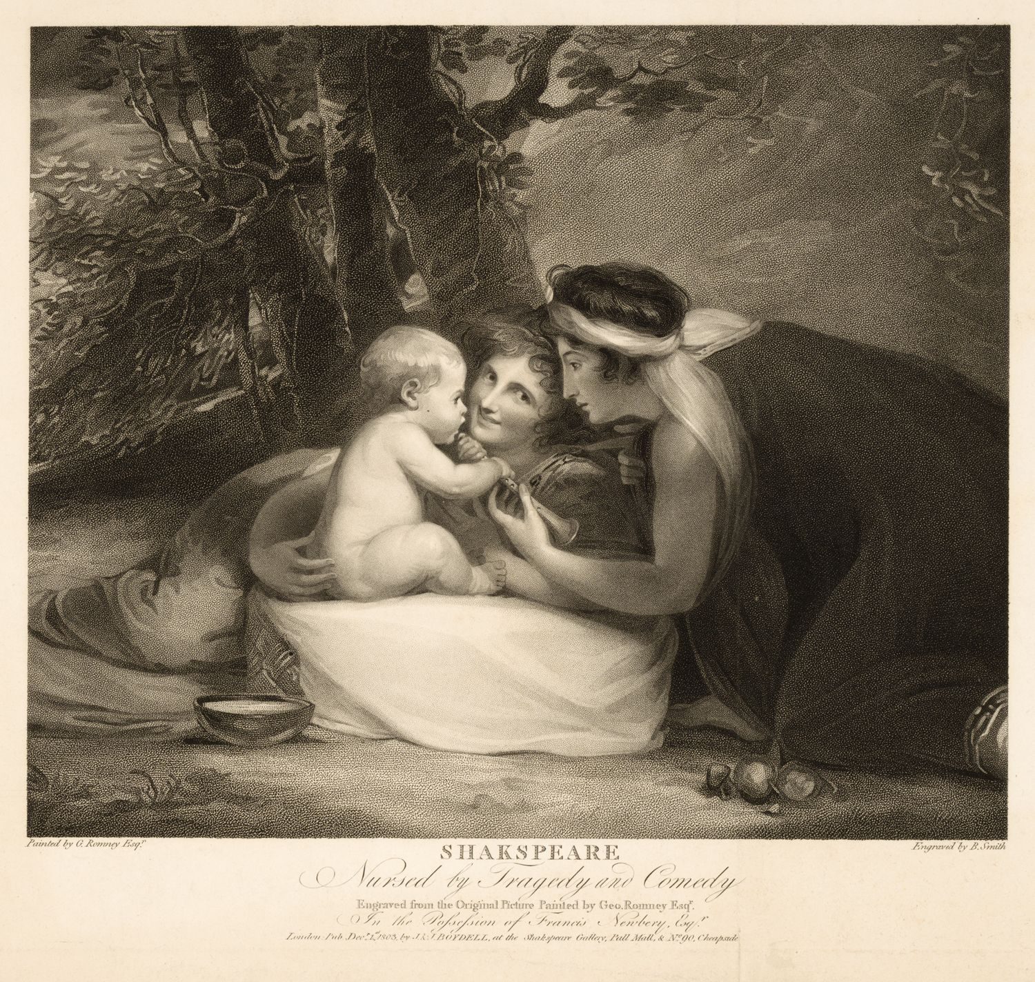 Infant Shakespeare was originally created for the Shakespeare Gallery founded by John Boydell (1720–1804) and his nephew Josiah (1752–1817). This fashionable London art gallery opened in 1789 and operated until 1805. The Boydell Shakespeare Gallery’s catalog described Romney’s allegorical scene in two sentences: