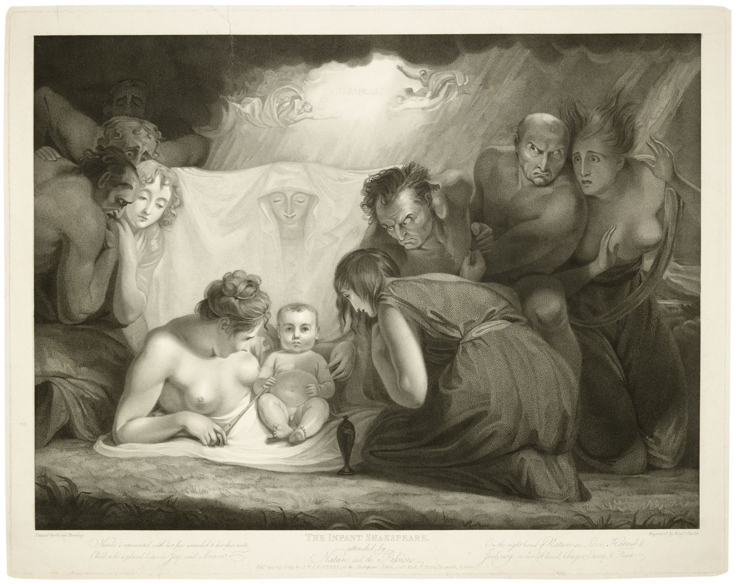 The other painting is the one now in the Folger collection. The same two models who posed for Comedy and Tragedy appear next to the baby, but this time they represent Joy and Sorrow. Unlike Shakespeare Nursed by Tragedy and Comedy, this scene is packed with other figures. Behind Joy and Sorrow in the center, we see Nature. On the left, Hatred and Love seem joined into a two-headed creature while Jealousy peers over their shoulders. From left to right on the other side, we see Anger, Fear, and Envy. The engraved version of the painting shows the details more clearly.