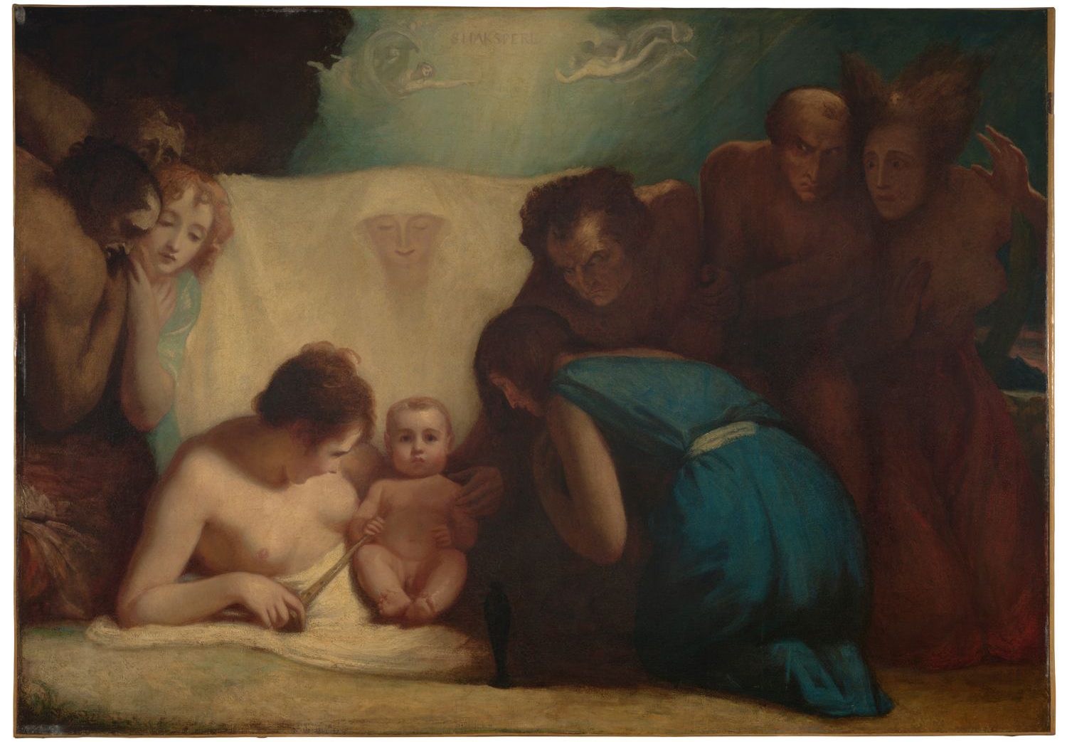 Eventually, the sketches led to two finished paintings. One is an intimate scene titled Shakespeare Nursed by Tragedy and Comedy. In it, baby Shakespeare interacts with the world around him and looks like a real baby. This painting has always been privately owned but was loaned to the Boydell Shakespeare Gallery for a time, and the Boydells published it as a print.